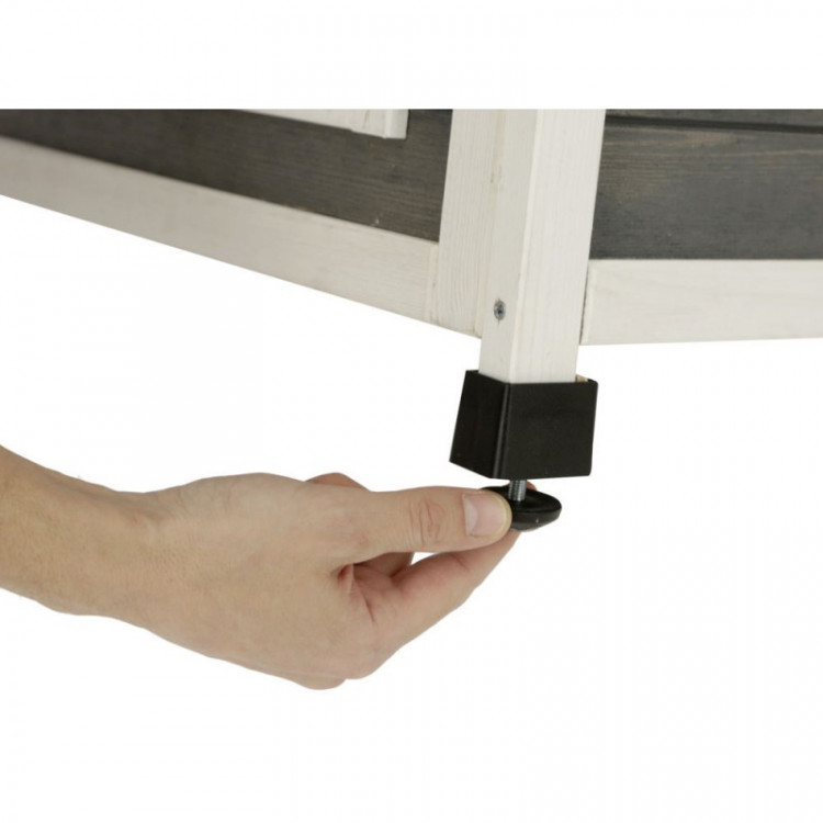Předvrtané otvory usnadňují instalaci a výškově nastavitelné nožky pomohou domek vyrovnat a zvednout nad zem.