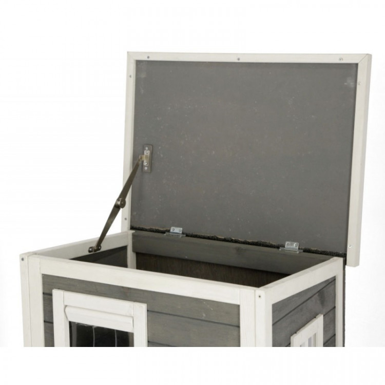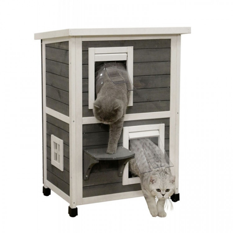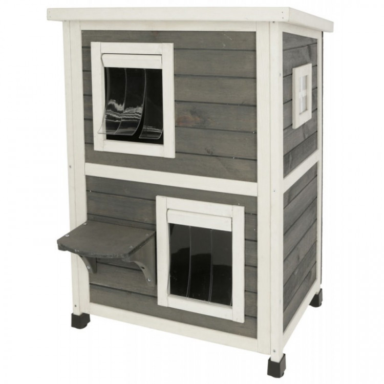 Dvě patra nejsou propojená jako průchozí „tunel“, takže se prostor přirozeně rozděluje. V praxi to může znamenat klidnější soužití (například když jedna kočka odpočívá dole a druhá si vybere horní patro). Součástí domku je také schůdek pro snazší přístup do horní části.