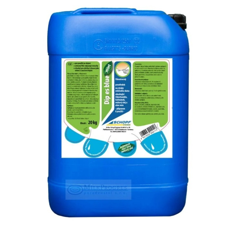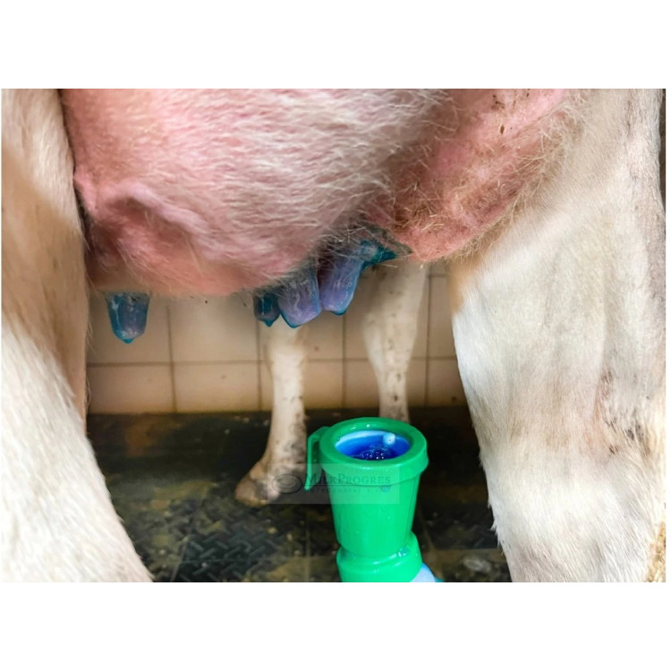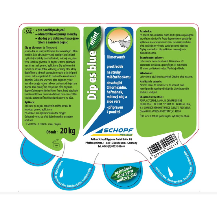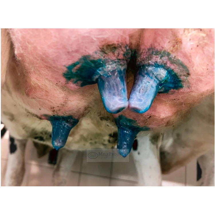 • vytvořený viditelný modrý ochranný film dezinfikuje a zároveň odpuzuje mouchy a chrání proti vstupu mikroorganismů do strukového kanálku mezi dojeními