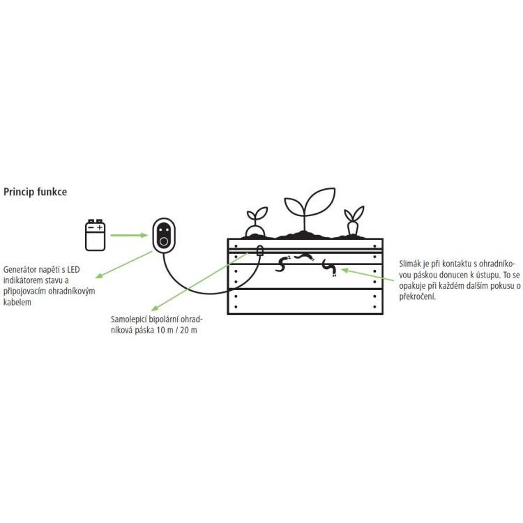Získáte ochranu záhonů před slimáky bez použití jedů a chemických přípravků. Funguje to tak, že slimák svým vlhkým tělem propojí dvě vodivé lišty na pásce a tím se uzavře okruh. Vznikne krátký elektrický impuls, který slimákovi způsobí nepříjemné brnění, takže se otočí zpět. Systém slimáky neusmrcuje – pouze je odrazuje od překročení bariéry.