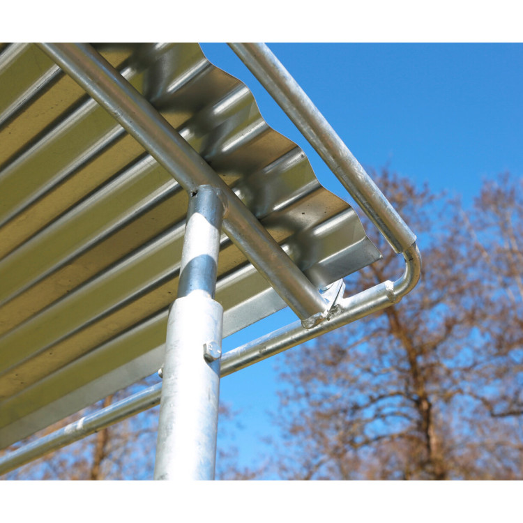 Pro venkovní provoz je důležitá odolná povrchová úprava. Příkrmiště je povrchově upravené pozinkováním při vysokých teplotách a má 1 čtvercovou trubkovou podpěru. Dodává se jako ucelená konstrukce včetně obvodové ochrany okraje střechy a se třemi bezpečnostními sponami, takže je připravené k použití bez skládání do stavebnice.