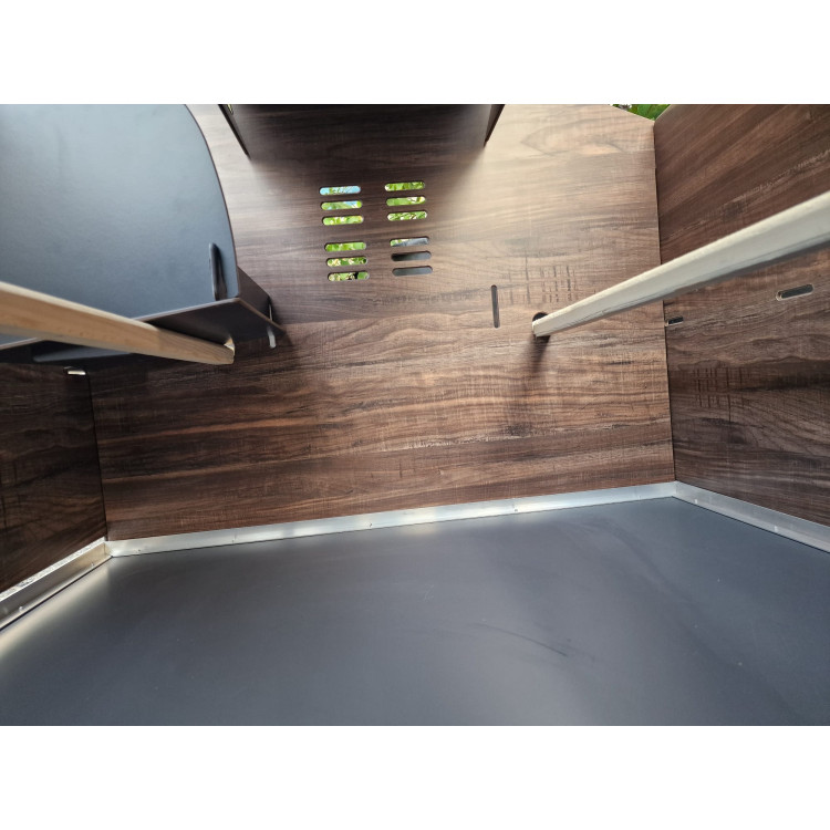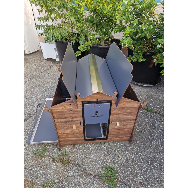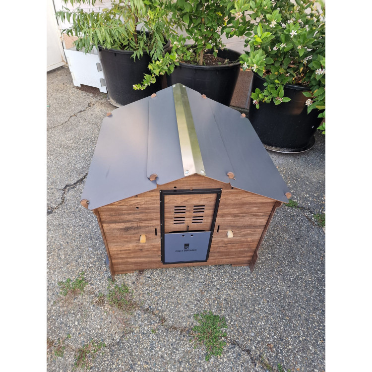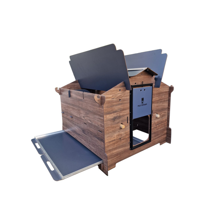 Konstrukčním materiálem kurníku je odolný HPL (High Pressure Laminate) – materiál, který kombinuje přirozený vzhled dřeva s mimořádnou pevností a trvanlivostí plastů. Na rozdíl od klasického dřeva nehnije, neabsorbuje vlhkost, nedeformuje se a je odolný vůči UV záření, dešti, mrazu a hlavně - vůči parazitům, jako jsou čmelíci. Oproti plastovým kurníkům je HPL pevnější, stabilnější a ekologičtější. Montáž zvládnete bez šroubováku – jednotlivé díly se spojují pomocí precizních zámkových spojů, které zaručují vysokou stabilitu a zároveň rychlou montáž i demontáž bez nutnosti používání nářadí. Uvnitř kurníku jsou dva dřevěné hřady (Ø 28 mm, délka 92,5 cm), výsuvný trusník pro snadné čištění a vnitřní vyvýšené snáškové hnízdo pro pohodlnou snůšku vajec. Střecha v matně šedé barvě poskytuje účinnou ochranu proti povětrnostním vlivům. Kurník je možné doplnit o automatický otvírač dvířek - například Polly AutoDefender, který zajistí otevírání a zavírání v přesný čas nebo podle světla – ideální řešení pro bezpečí slepic, i když nejste doma.