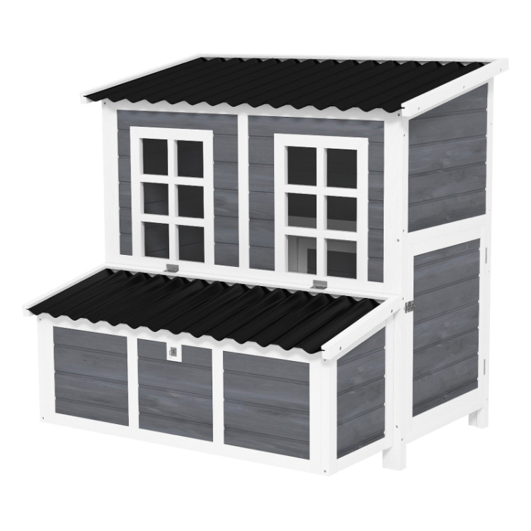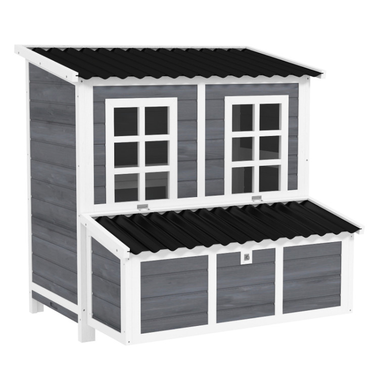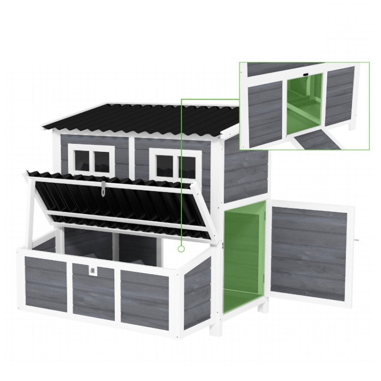 Díky dvěma vstupním dveřím a rampě mohou slepice volně a bezpečně přecházet mezi kurníkem a venkovním prostorem. Vnitřní hřady poskytují komfortní místo pro odpočinek a spánek, zatímco okna zajišťují dostatek světla a umožňují kontrolu hejna bez zbytečného rušení. Kurník je vyroben z kvalitního masivního jedlového dřeva a ošetřen voděodolným nátěrem, který prodlužuje jeho životnost. Vyvýšené provedení chrání konstrukci před vlhkostí od země a zlepšuje cirkulaci vzduchu. Plastová střecha pak poskytuje spolehlivou ochranu proti dešti a nepříznivému počasí.