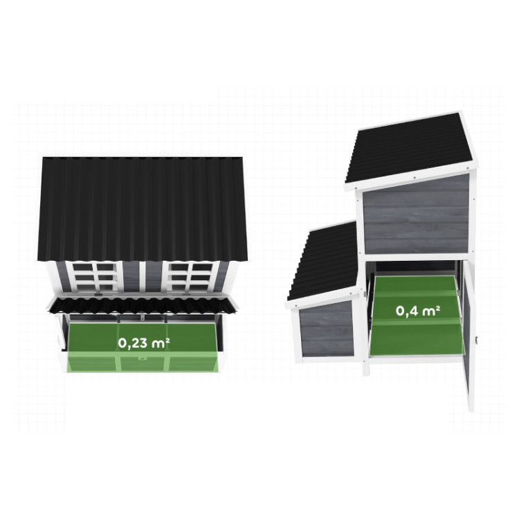 Údržbu výrazně usnadňuje výsuvný trusník, díky kterému je čištění rychlé a hygienické. Kurník je navržen tak, aby byl praktický při každodenním používání, a zároveň poskytoval slepicím stabilní a klidné prostředí.
