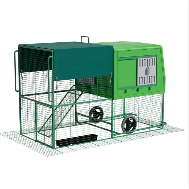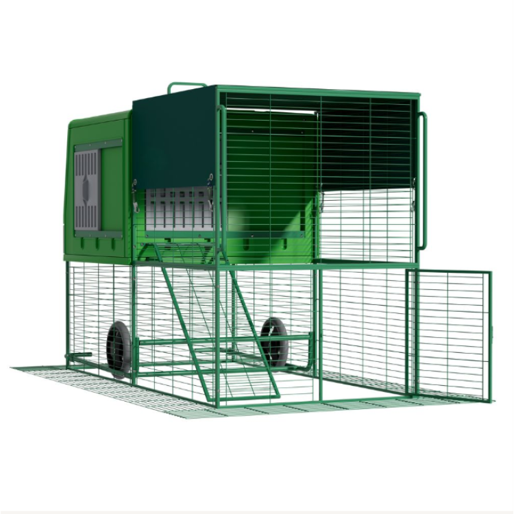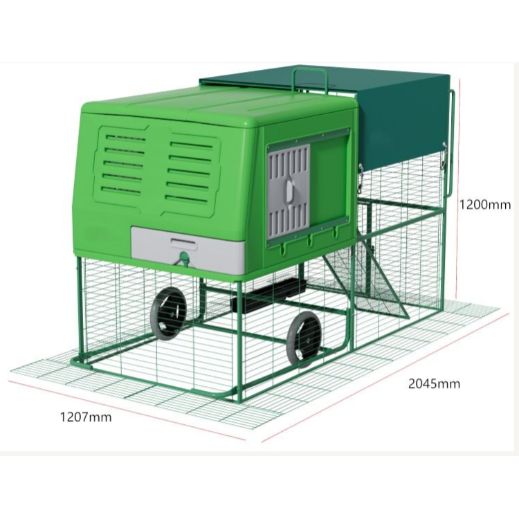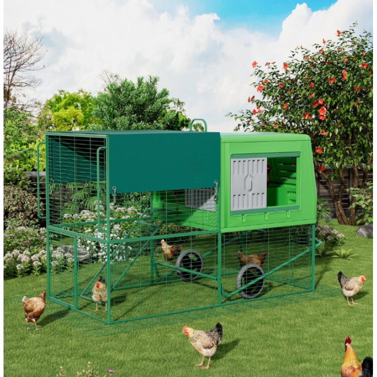 Díky integrovaným kolečkům lze kurník relativně snadno přemístit na jiné místo zahrady. Přesun na čerstvou trávu podporuje přirozené chování slepic a pomáhá rovnoměrně zatěžovat pozemek.