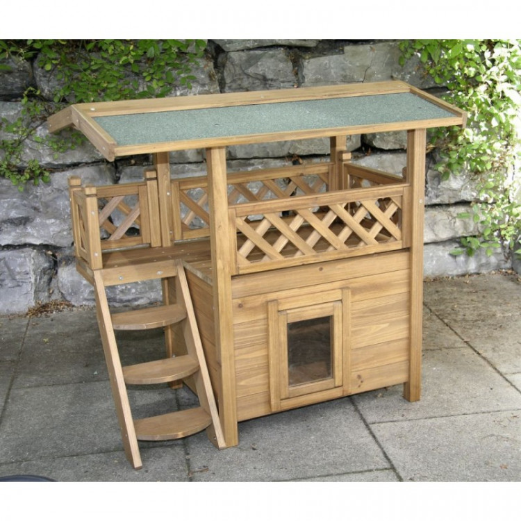 Kočka může využít nejen vnitřek boudy, ale i terasu se schůdky pro pohodlné polehávání a rozhled.