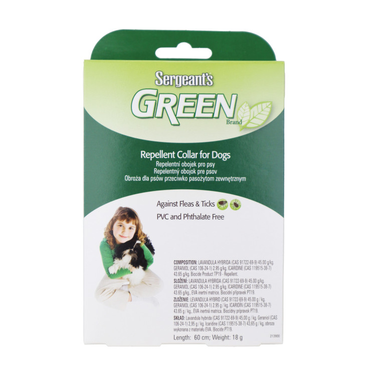 Přírodní repelentní obojek Sergeant’s Green je určen pro psy a pomáhá chránit zvíře před obtížným hmyzem. Obsahuje přírodní účinné látky rostlinného původu, které působí repelentně a pomáhají odpuzovat blechy, klíšťata a další létající hmyz.