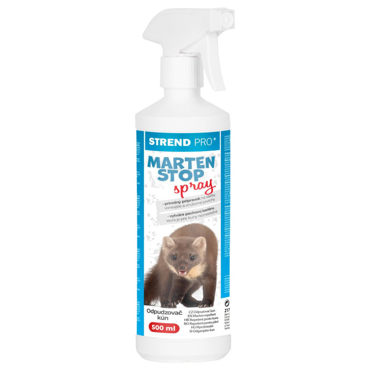 Strend Pro MARTEN STOP je vysoce účinný sprej určený k ochraně proti kunám. Je založen na speciálních aromatických složkách, které jsou pro člověka nepostřehnutelné, ale pro kuny velmi nepříjemné. Po aplikaci vytváří ochrannou vrstvu odolnou vůči teplu i povětrnostním vlivům, díky čemuž zajišťuje dlouhodobou ochranu. Vhodný pro použití na plastové části, chráněné elektrické systémy, v domácnosti, na půdách i v garážích.